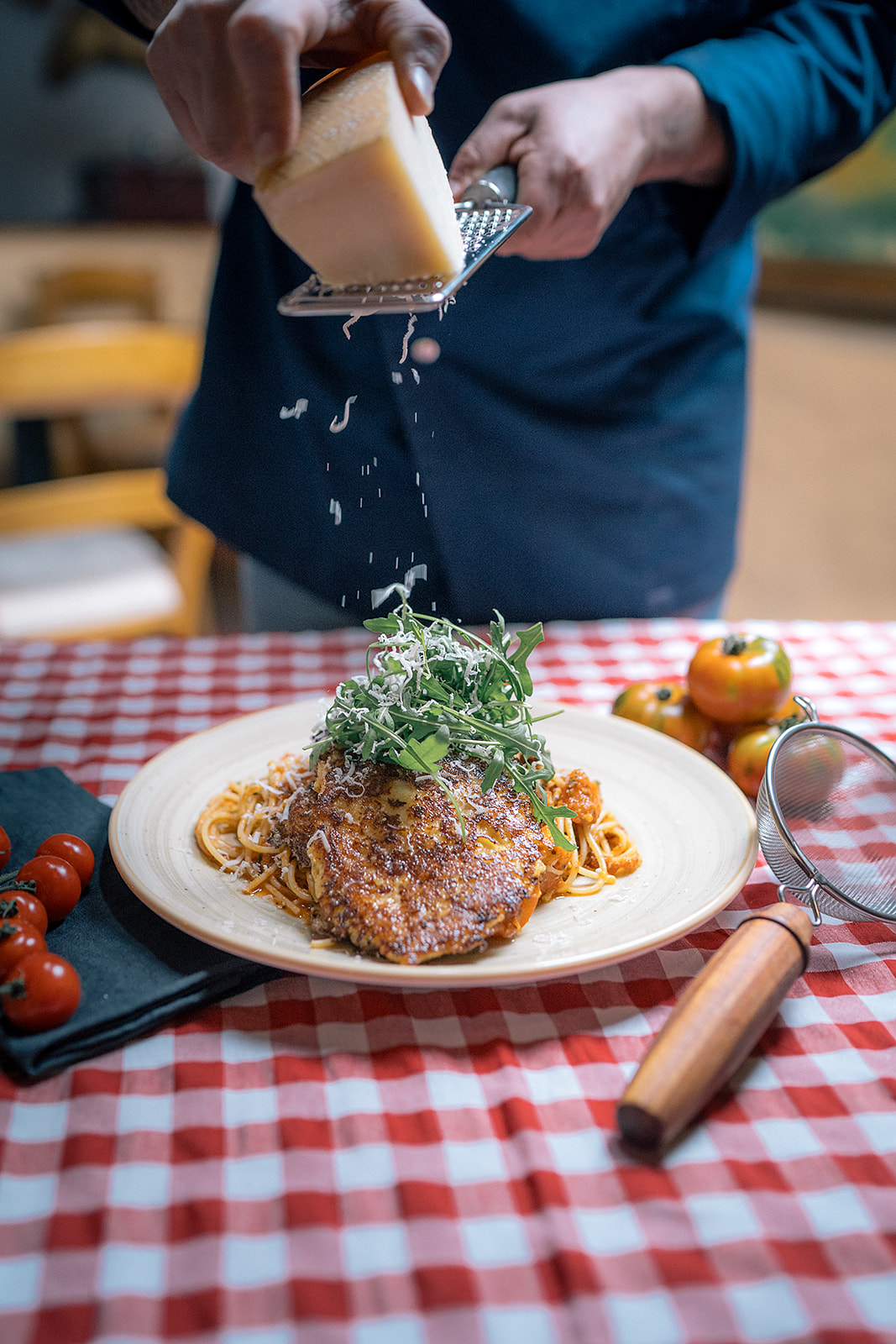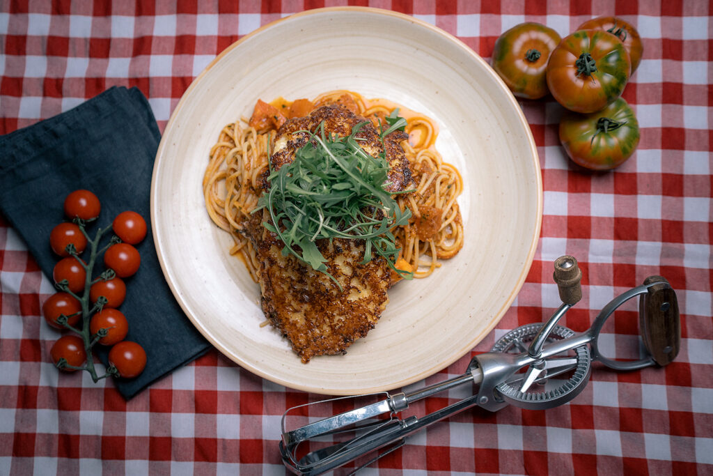 Hühnerfleisch überbacken mit Ei und Parmesan auf Spaghetti mit Kräuter-Tomatensauce